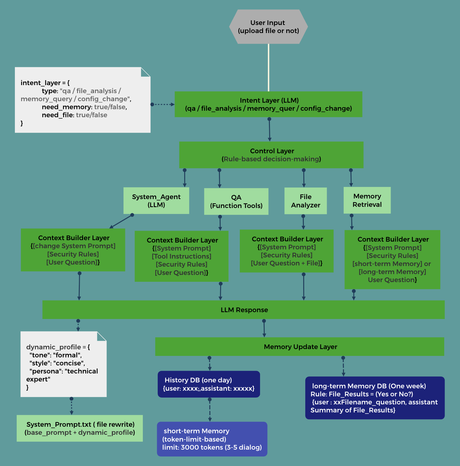 - Implement a user intent analyzer (intent router) to decide whether the LLM can directly answer using function calling, if short-term memory is needed, if long-term memory is needed, if file analysis should be triggered, or if the system role personality and answer style should be adjusted.